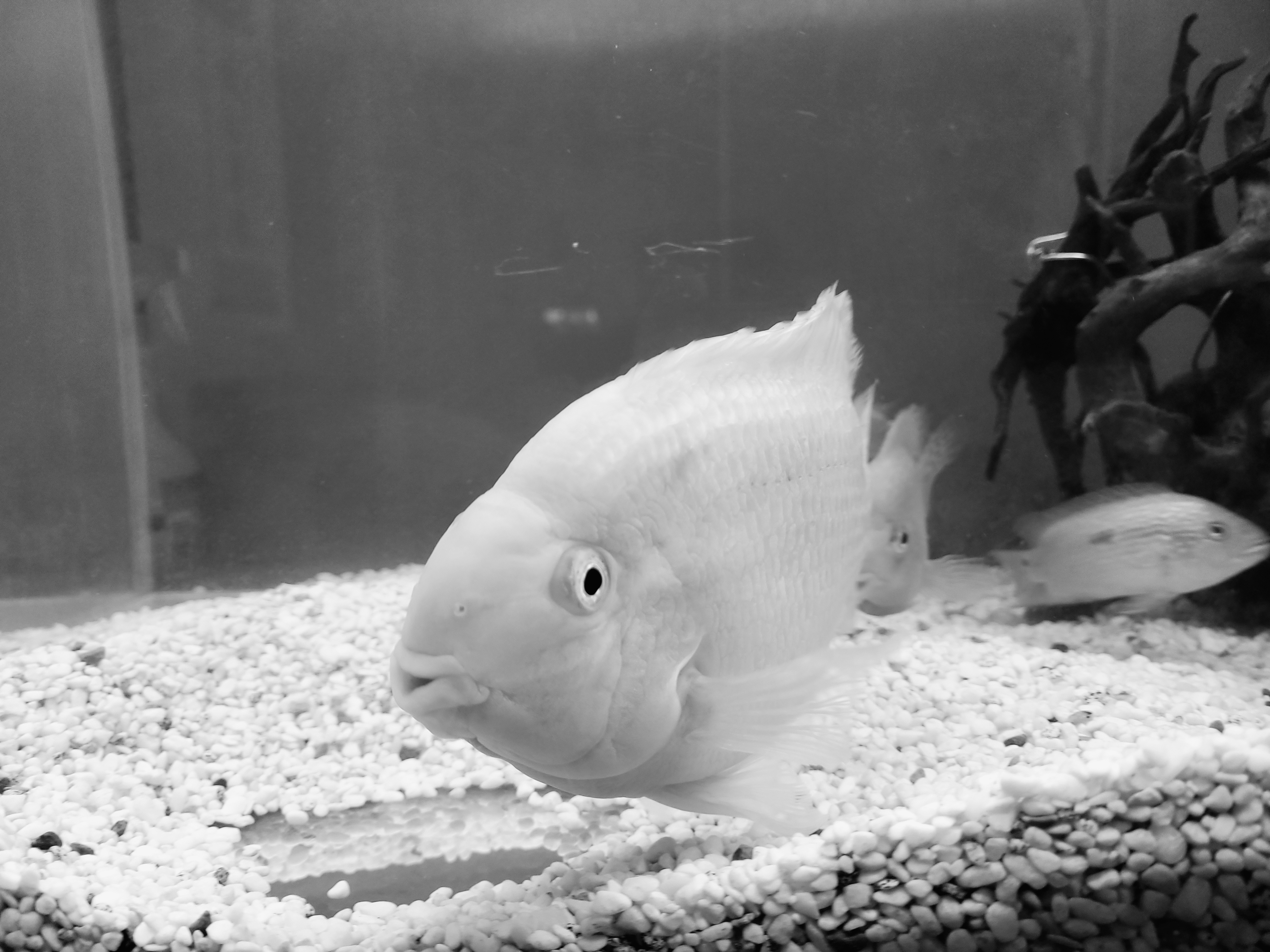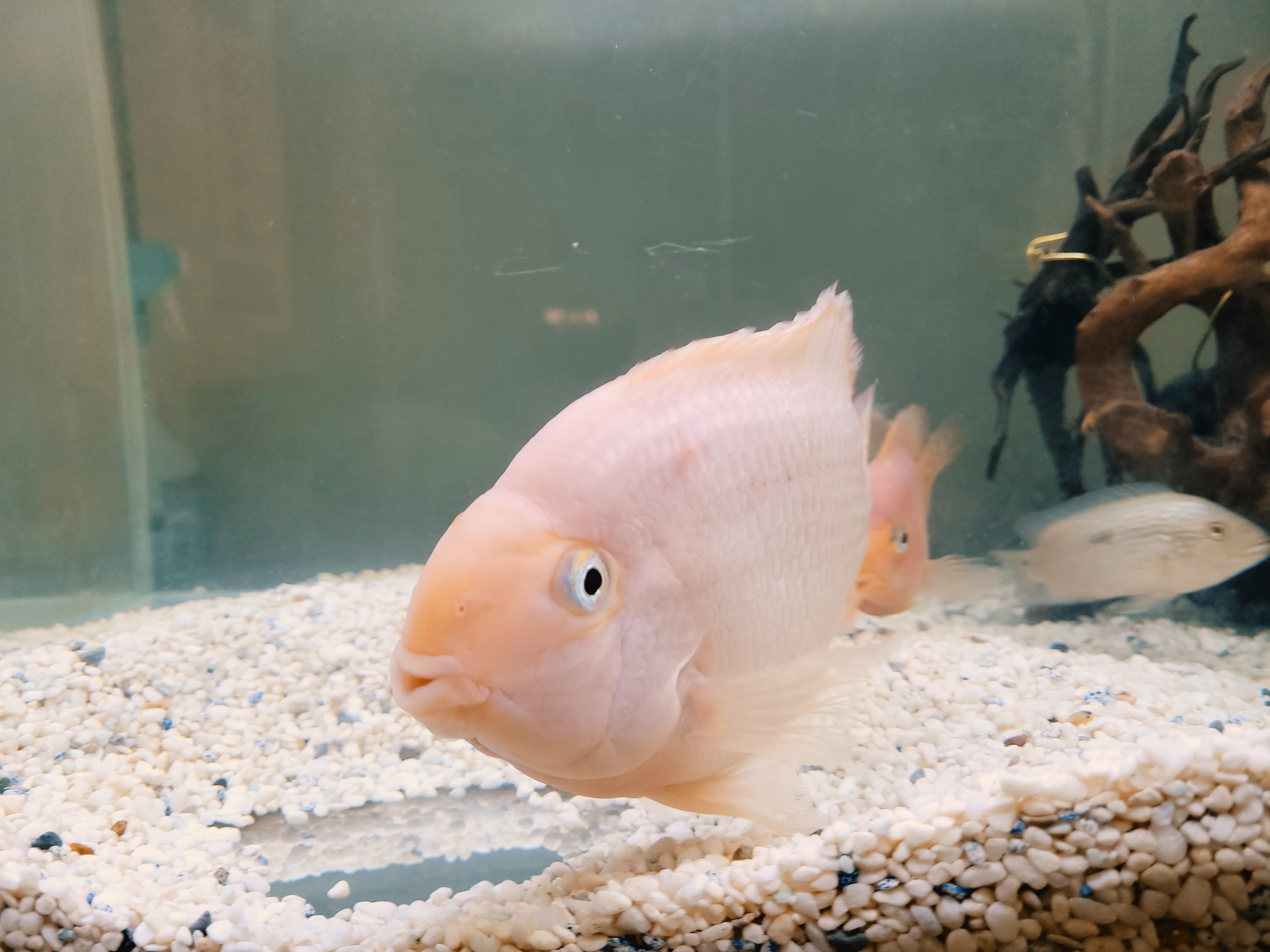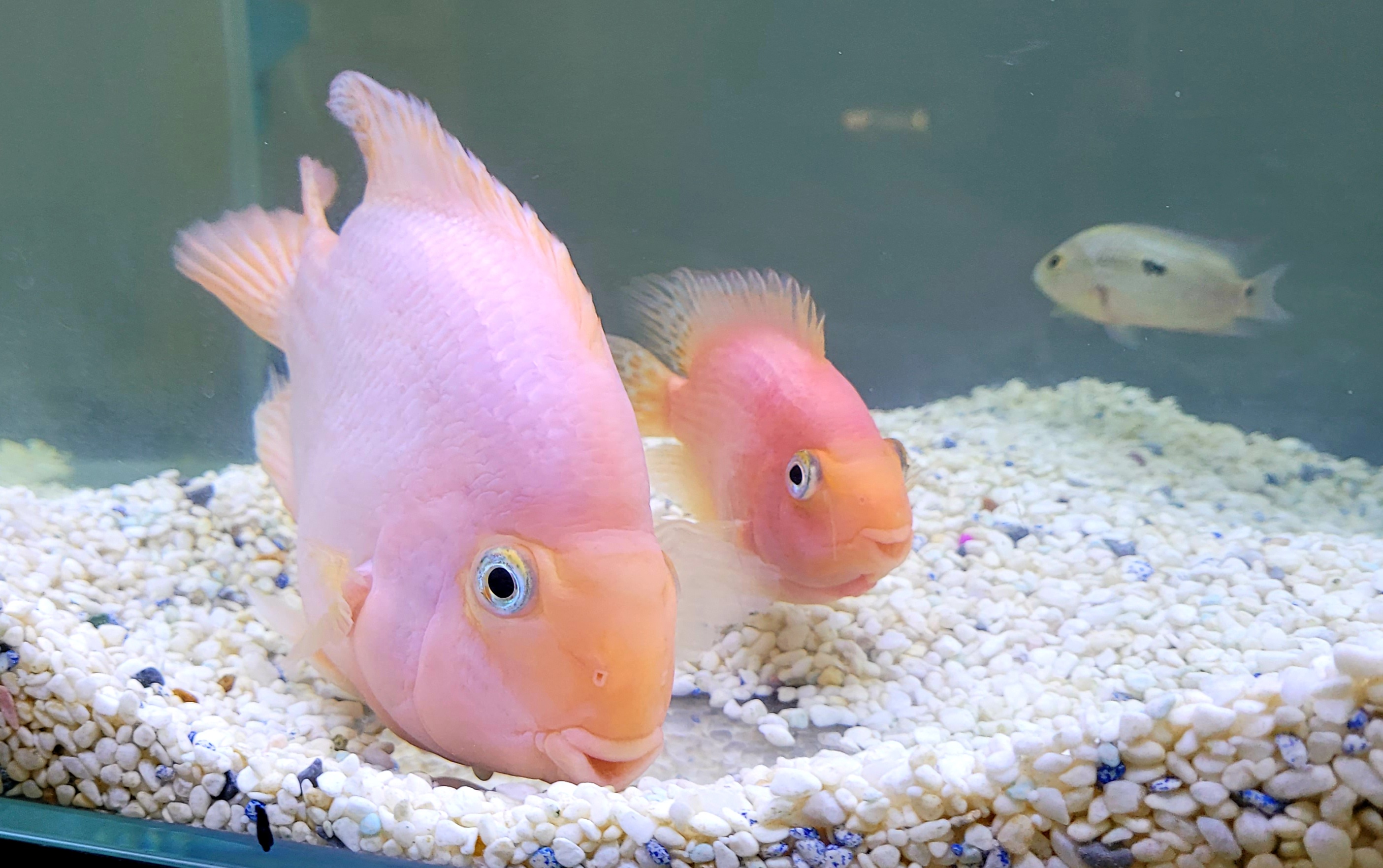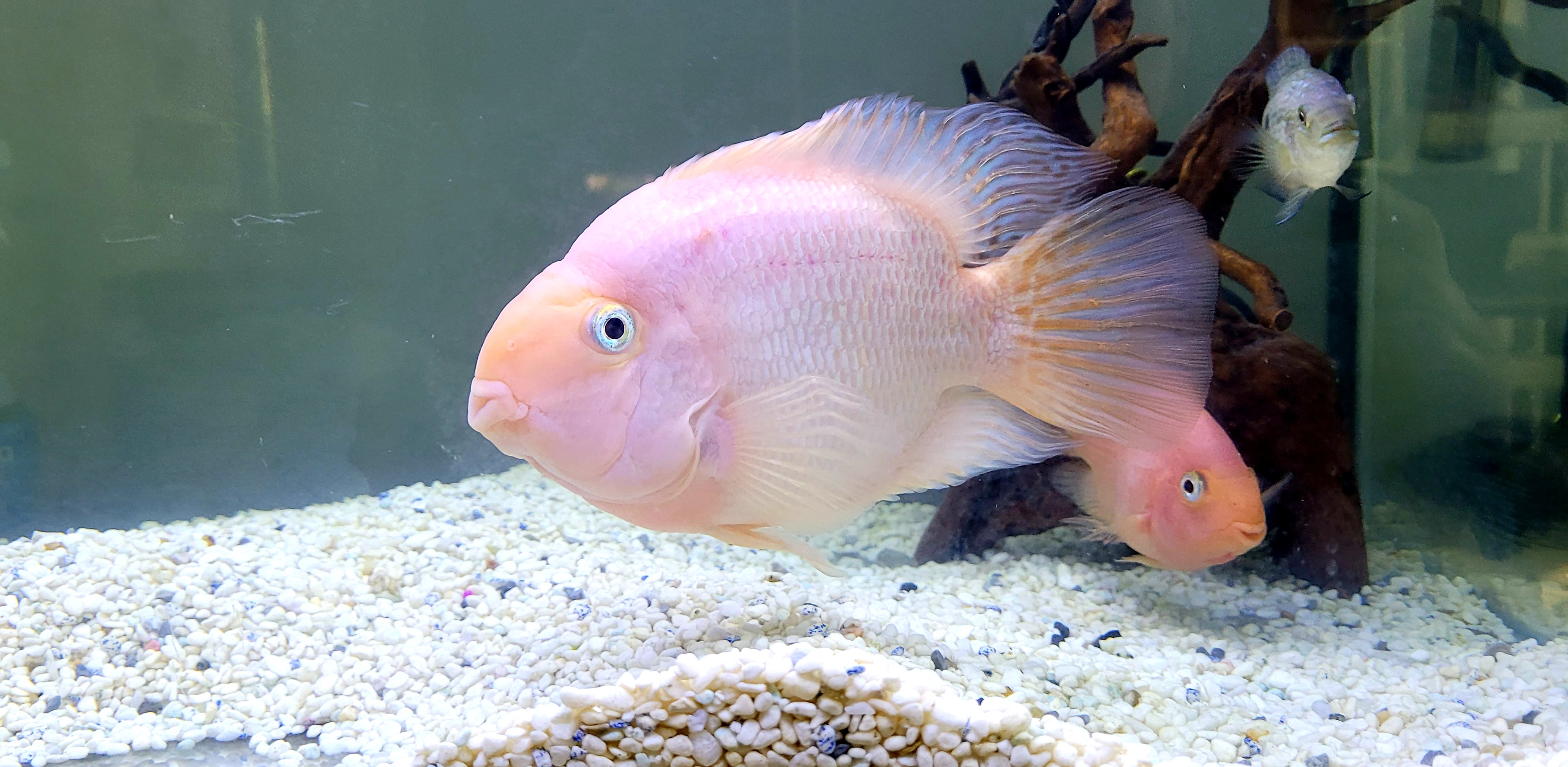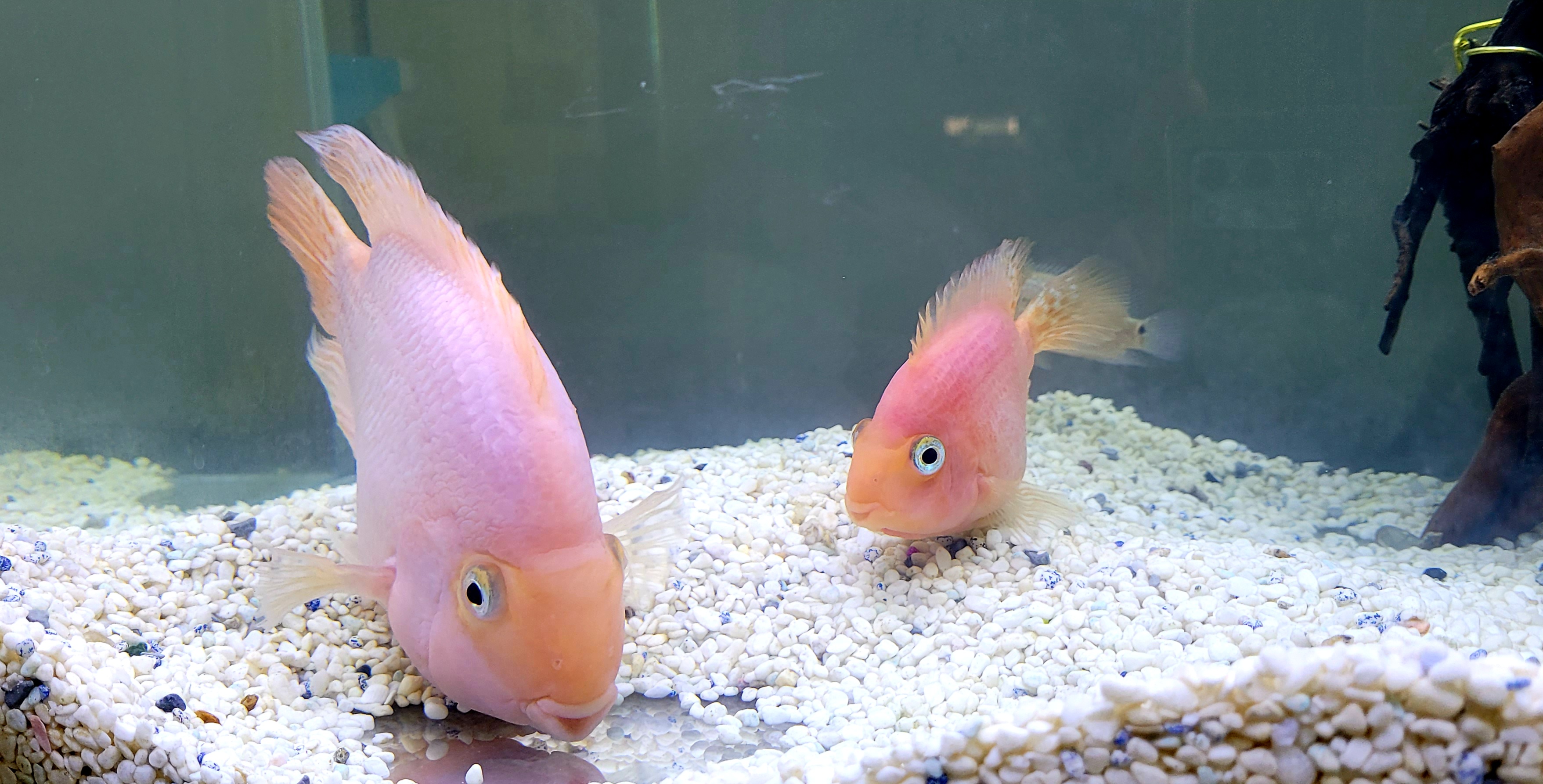 암수 구별이 쉽지 않으나 산란기가 되면 암수가 구별이 되며 암놈은 성격이 사납고 수놈은 발정 기외에는 온순한 성격으로 식성이 좋아 사료는 주는 데로 잘 먹고 성장 속도는 개체에 따라서 다르나 2년 정도에 20cm 이상 자란다. 암놈 보다가는 수놈이 덩치가 더 크며 암놈이 산란을 하면 수놈이 수정을 하는데 부화는 되지 않고 알이 하얗게 변하면 어미가 알을 거의 먹어서 없앤다. 산란주기는 20일에서 30일 사이에 한 번씩 산란(산란장소가 없으면 잘 모르고 넘어감)을 하는데 산란기에는 예민해져서 암수 모두가 공격적인 성격이므로 수족관 청소 시에는 주의해야 한다. 산란은 수족관의 장식물에 하는데 웬만하면 산란장소를 없애서 산란을 못하게 하는 게 좋다. 산란 후 알이 부패하면서 수족관 물도 빨리 오염이 되고 악취가 나는 경우가 있다. 또한 개채수는 2마리 이상 한 수족관에서 키우면 작은 녀석은 큰 녀석들한테 공격을 당해서 죽게 되므로 한 수족관에 2마리만 기르는 게 가장 자연스럽게 적응한다. 혈앵무들 습성이 모래를 가지고 노는 것을 좋아하기 때문에 바닥에 모래를 깔아주면 좋다.